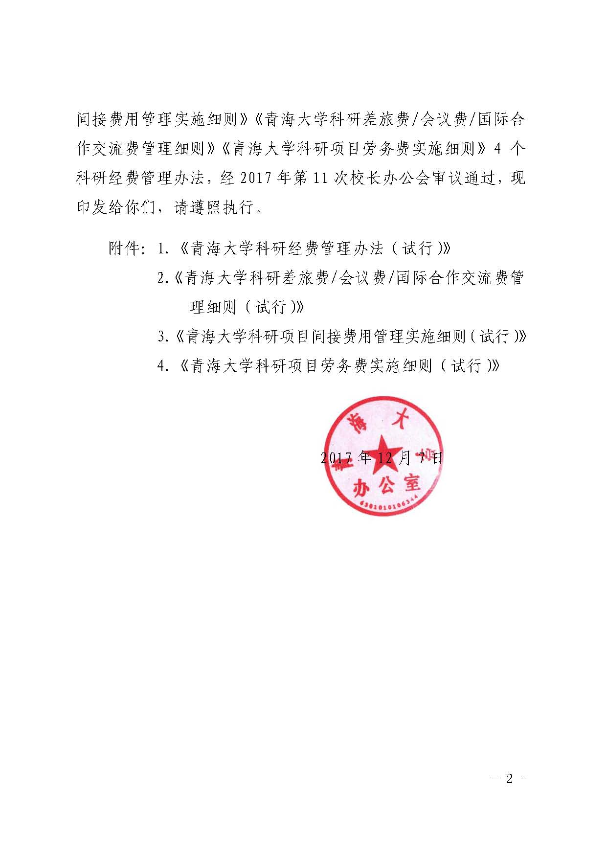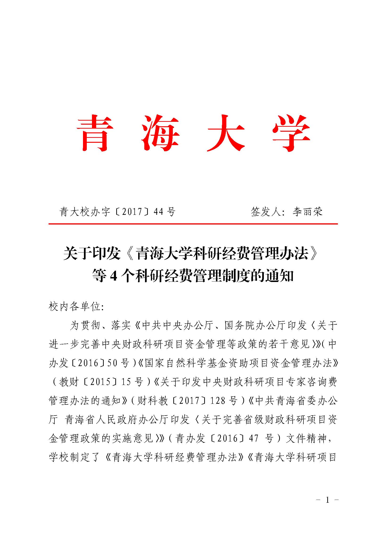 关于印发《青海大学科研经费管理办法》等四个科研经费管理制度的通知